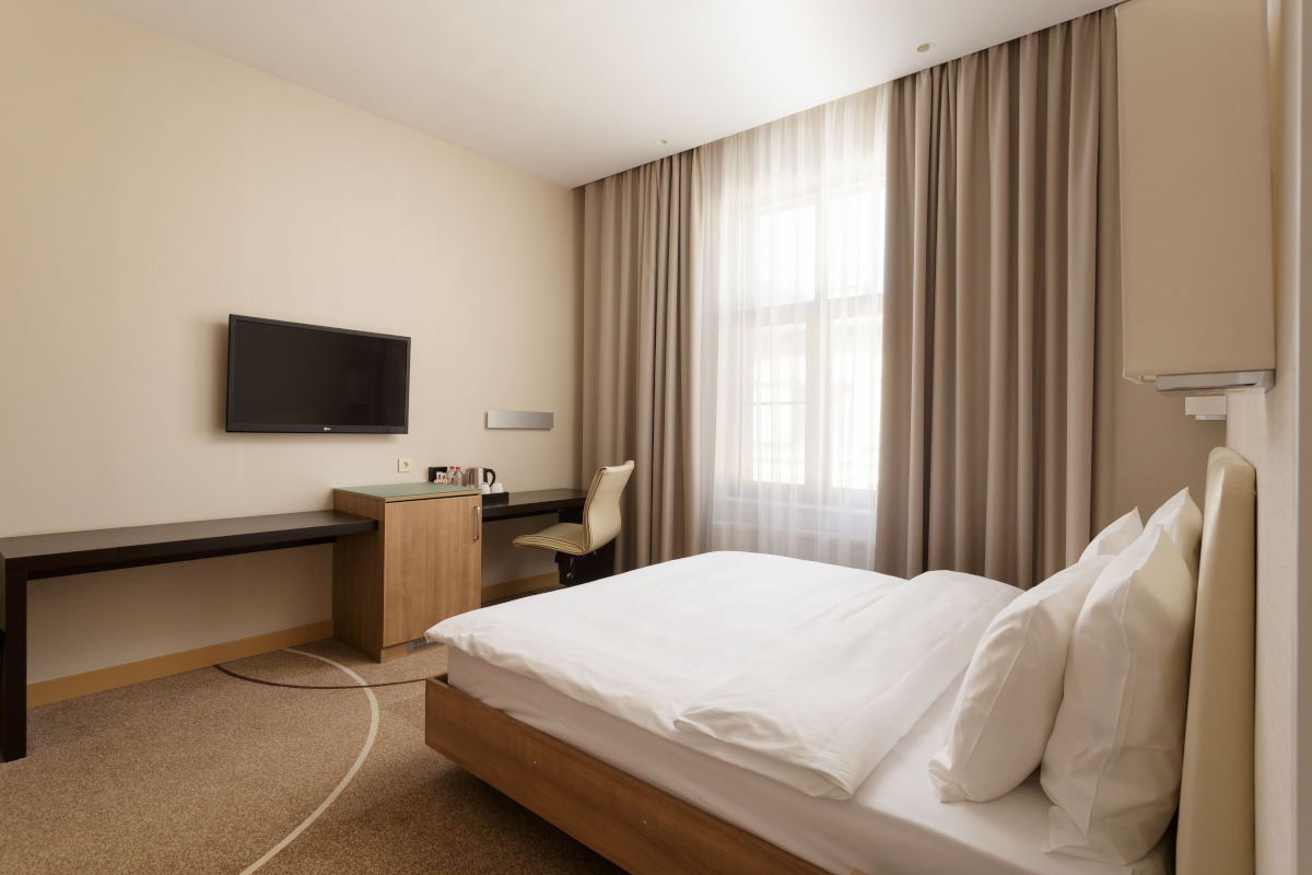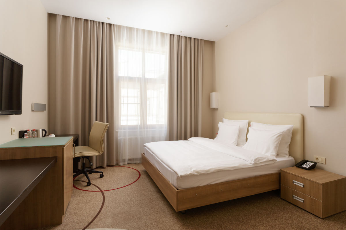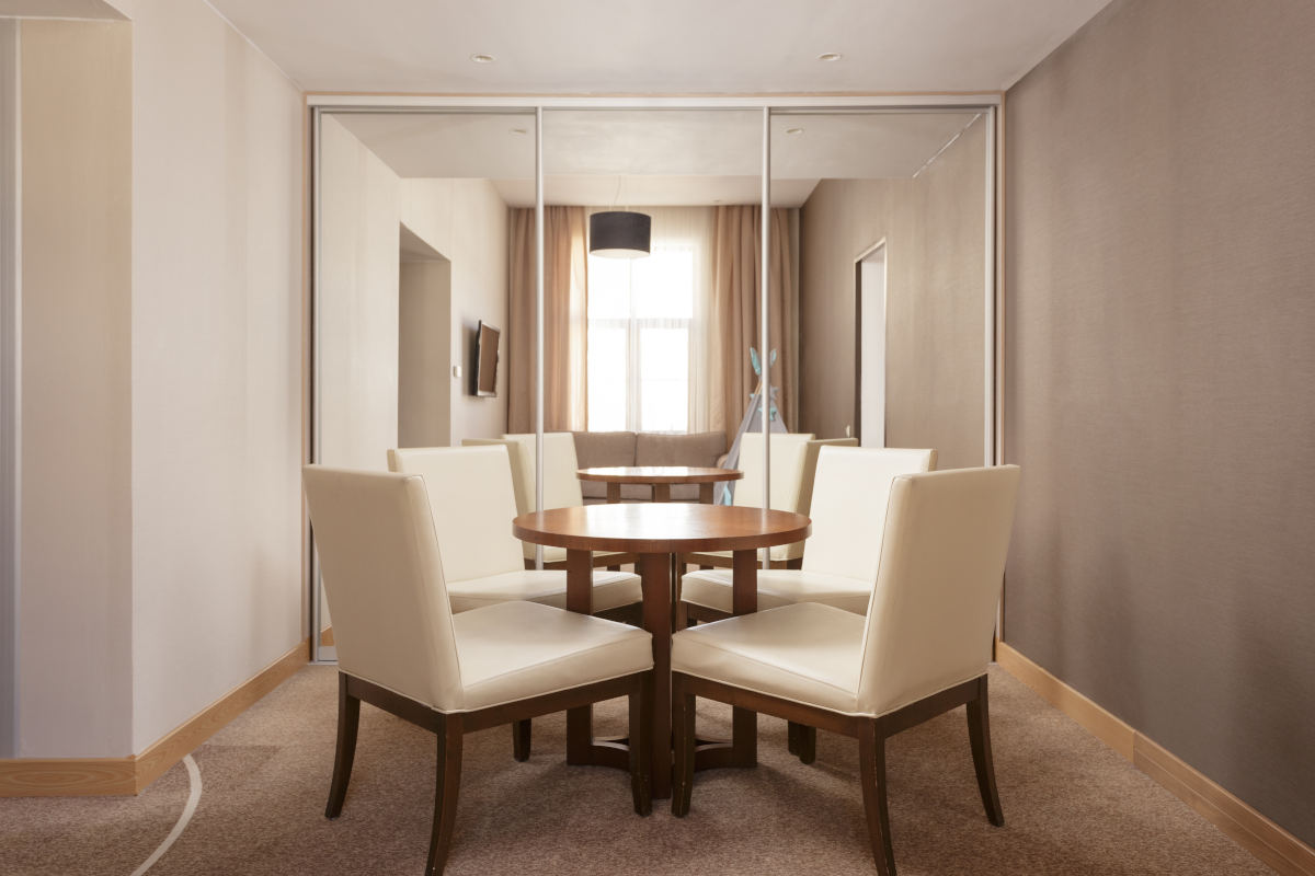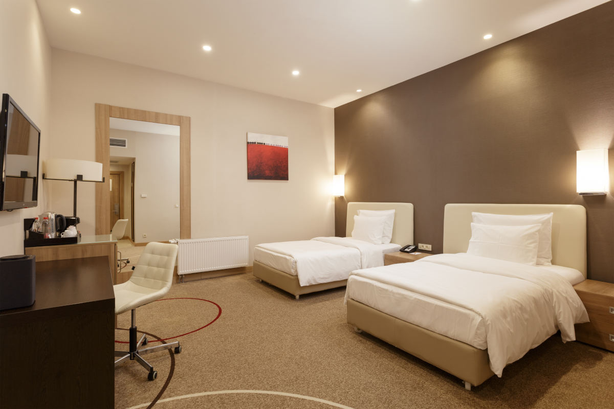 Просторный семейный номер состоит из двух спален и гостиной зоны. В первой спальне размещена одна двуспальная кровать, во второй — две полутороспальные. Гостиная оборудована удобной мягкой зоной с раскладным диваном для дополнительного места отдыха, а также обеденной зоной. Окна номера выходят во внутренний двор. Обратите внимание: представленные фотографии носят ознакомительный характер — фактическая планировка, площадь и комплектация могут незначительно отличаться в зависимости от конкретного номера.